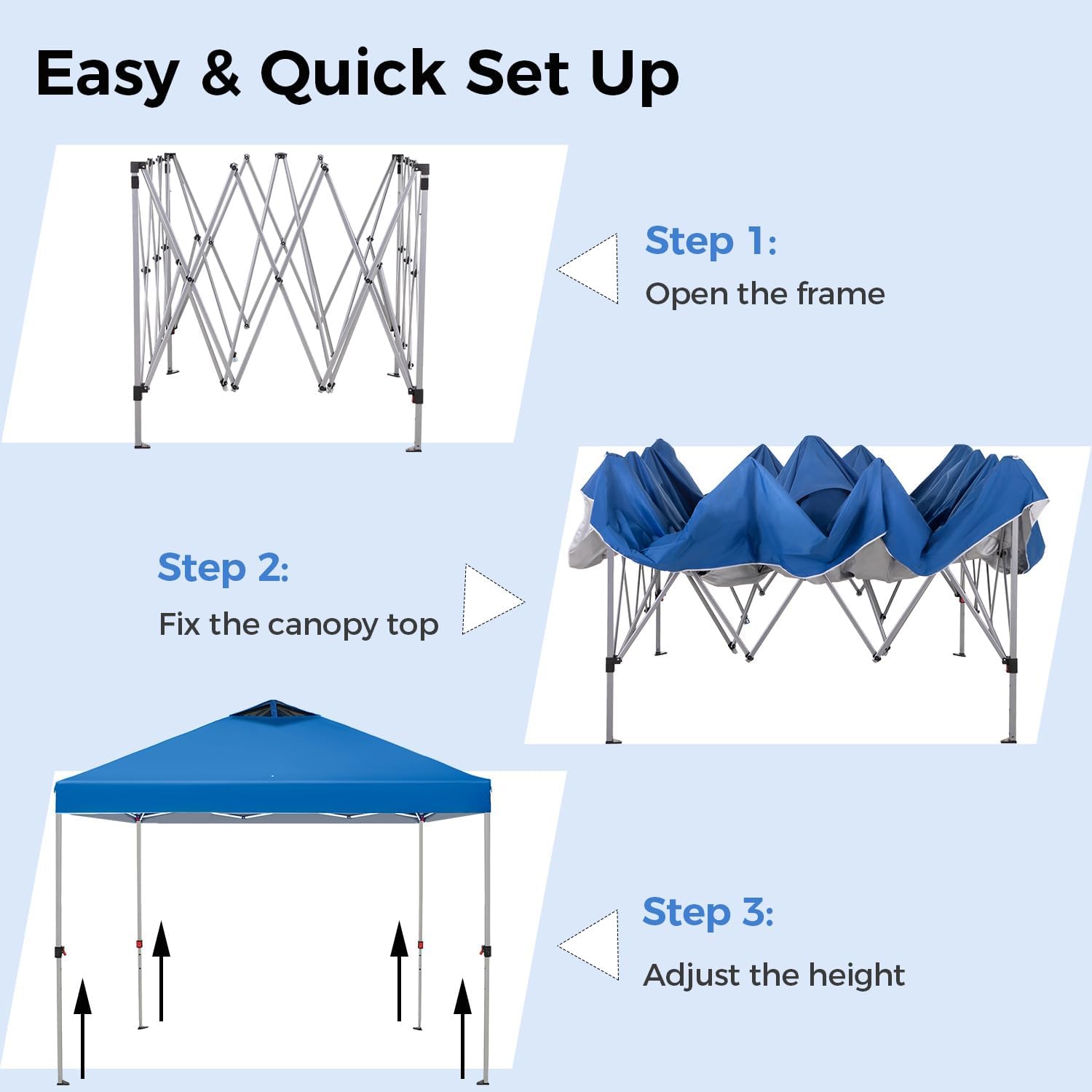 The pop-up design sets up in under 5 minutes without tools. Extend the frame, spread out the tarpaulin and adjust the height. Folds compactly for storage.